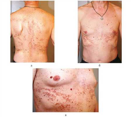Кожный статус. На коже туловища — множественные фолликулярные и парафолликулярные папулы красно-бурого цвета, местами сгруппированные в мелкие бляшки, покрытые плотными чешуйками. В центре папул — роговые пробки. Там, где пробки отторглись, кратерообразные углубления, заполненные нанесенным ранее циндолом. На месте разрешившихся элементов — мелкие рубчики. При пальпации высыпания плотные, кожа напоминает «терку», влажная. Несколько внутридермальных невусов округлой куполообразной формы, мягкой консистенции, коричневого цвета (рисунок, а—в). Рисунок 1. Пациент Б., 57 лет: проявления БК. Пациент страдает сахарным диабетом, диабетической нефропатией. а—в — множество розовато-красного и сероватого цвета папул и узлов с роговыми пробками. В тех местах, где больной расчесывал кожу, элементы сыпи располагаются линейно (симптом Кебнера). Несколько внутридермальных невусов. Кожа головы, конечностей, видимые слизистые оболочки без высыпаний, физиологической окраски.