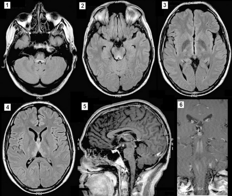 1 — гиперинтенсивный сигнал не только от периакведуктального серого вещества и маммилярных тел, но и белого вещества среднего мозга.