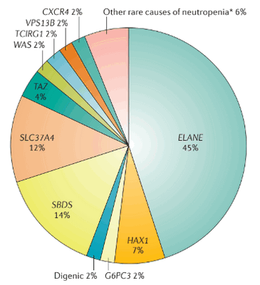 На сегодняшний день идентифицированы мутации четырех генов: ген нейтрофильной эластазы (ELA2), ген GFI1, ген HAX1 и гены активации болезни Вискотта-Олдрича - WASP. Сочетание этих мутаций приводит к дефициту образования нейтрофилов.