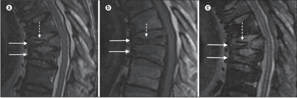 Сплошные стрелки указывают на переднюю компрессионную деформацию. На снимках а и c видна «двойная линия», то есть вакуумная расщелина (пунктирная стрелка), окруженная отеком. На изображении b визуализируется отсутствие внутри позвоночных тел вакуумных расщелин (пунктирная стрелка)[1].