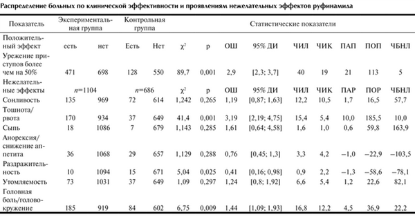 По каждому из соответствующих показателей оценивали статистическую значимость различий в группах сравнения по непараметрическому критерию χ 2 и вычисляли следующие унифицированные показатели клинической эффективности [22]: 1) отношение шансов (ОШ) позитивного исхода или наступления нежелательного эффекта (ОШ) с 95% доверительным интервалом (95% ДИ) [23]; 2) частоту результатов лечения руфинамидом позитивных или нежелательных исходов (ЧИЛ, %); 3) частоту результатов лечения позитивных или нежелательных исходов в контрольной группе (ЧИК, %); 4) повышение абсолютной пользы (АП) или абсолютного риска (ПАР) нежелательных эффектов при лечении руфинамидом (ПАП=ЧИЛ-ЧИК, %); 5) повышение относительной пользы (ПОП) или относительного риска (ПОР) нежелательных эффектов от лечения руфинамидом (ПОП= ПАП·100%/ЧИК, %); 6) число больных, которым необходимо лечение руфинамидом для достижения с позитивным или наступления неблагоприятного эффекта (ЧБНЛ=1·100%/ПАП, усл.ед.).