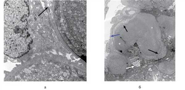 Рис. 3. Трансмиссионная электронограмма. а — вакуоли в просвете капилляра формируют ламинарные слои «липопротеинового тромба». Участок расщепления базальных мембран (черная стрелка). Субэндотелиальный депозит (белая стрелка), ×9500; б — интракапиллярные тромбы, состоящие из концентрических слоев (черные стрелки) мелковакуолизированного материала — «липопротеиновые тромбы». Локально вакуолизированный материал располагается в мезангии (белая стрелка) и в участках расщепления базальных мембран (синяя стрелка), ×3000.