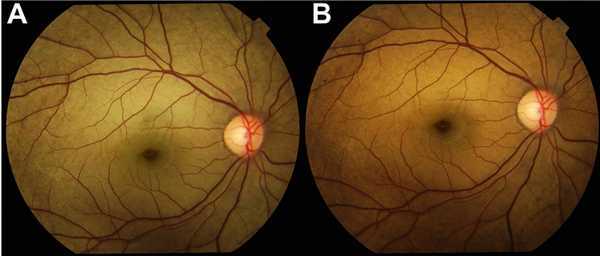 Проверка пациентов показывает нормальные поля зрения, но глазное дно имеет диффузный или очаговый вид, серебристо-серый или золотисто-желтый металлический блеск и сосуды сетчатки рельефно выделяются на его фоне.