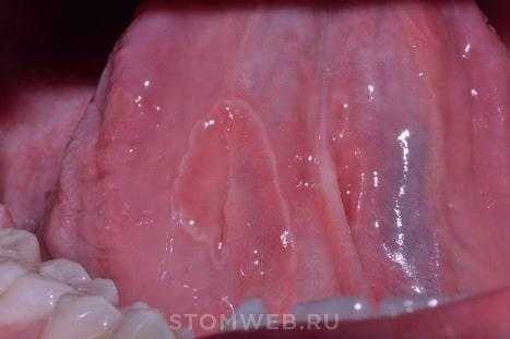Изъязвление вентральной поверхности языка, вызванные травмой от его постоянного движения вперед-назад над нижними резцами (Рис. 10.5 В). Когда-то встречался при коклюше,сейчас женаблюдается чаще у детей, страдающих церебральным параличом.