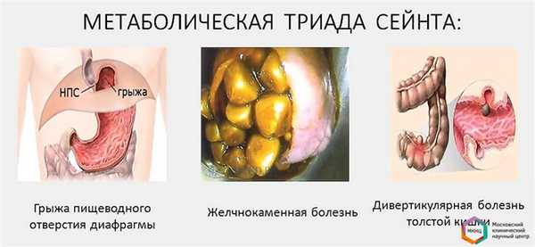 Метаболическая триада Сейнта - сочетание диафрагмальной грыжи, желчнокаменной болезни, дивертикулеза толстого кишечника.