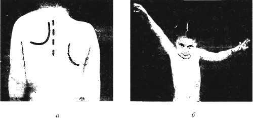 Рис. Девочка 5 лет с болезнью Шпренгеля (контуры обеих лопаток обведены сплошными линиями): а — левая лопатка расположена выше правой, уменьшена в размерах, смещена к позвоночнику, на стороне поражения надплечье расположено выше, чем на здоровой стороне; б — та же девочка с поднятыми руками (резко ограничена функция левого плечевого сустава).