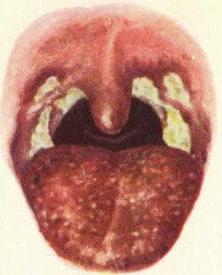 Клиническая картина. Данный синдром проявляется резким подъёмом температуры тела, вплоть до развития септического шока. При орофарингоскопии отмечаются островчатые некрозы слизистых оболочек нёбных миндалин, задней стенки глотки и мягкого нёба. Возможно развитие язвенно-некротической ангины с дифтерийно подобными налётами. Регионарные лимфатические узлы выглядят припухшими и болезненными при пальпации.