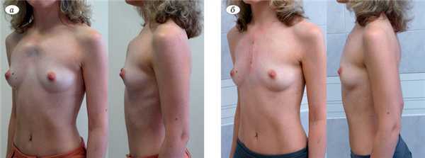 Пациентка Б., 33 лет, в июле 2014 г. поступила в 10-е отделение ЦИТО им. Н.Н. Приорова с жалобами на наличие грубой ДГК и обусловленный этим косметический дефект (рис. 1, а). Рис. 1. Внешний вид пациентки Б., 33 лет, с комбинированной ДГК симметричной формы (2-й тип) до (а) и через 8 дней после (б) операции. ДГК появилась с рождения и прогрессировала пропорционально росту организма. Наследственность не отягощена.