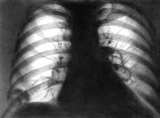 На рентгенограммах легких выявляются инфильтраты, имеющие иногда «летучий» характер, с образованием полостей до 5 см в диаметре (фибринозно-гнойная пневмония с некрозом). Обширные инфильтраты легочной ткани с большими полостями распада - характерный рентгенологический признак гранулематоза Вегенера.