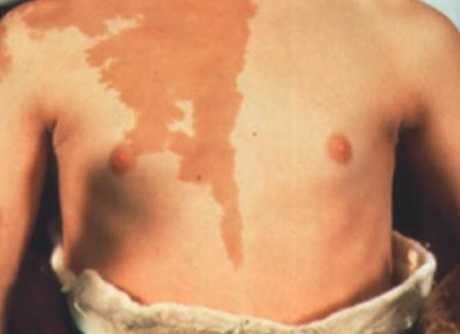 - пятнистой пигментации кожи - лентиго, пятна с четкими границами светло-коричневого цвета обычно есть от рождения на груди, спине пояснице, бедрах и в местах костных деформаций;