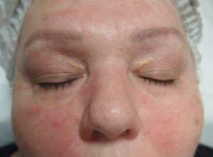 Через три недели пациент пришёл на контрольный осмотр. Большая часть поверхности кожи лба и боковых скул была свободна от новообразований. Пациент прошёл обследование, в результате которого у него выявлен вирус ВПЧ. Специалистом-иммунологом рекомендована соответствующая терапия. Оставшиеся плоские элементы диаметром 2-3 мм предложено удалить препаратом для химической деструкции - Веррукацидом ® - в домашних условиях.