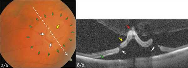 а — цветная фотография: тракционный разрыв (указан белыми стрелками) с клапаном (указан желтой стрелкой) с субклинической отслойкой сетчатки вокруг разрыва (указан зелеными стрелками); белая пунктирная стрелка указывает направление кросс-секционного сканирования; б — соответствующий ОКТ-скан в режиме Enhanced HD Line (RTVue XR Avanti) ретинального разрыва (указан белыми стрелками), клапан (указан желтой стрелкой) с выраженной тракцией стекловидного тела (указано красной стрелкой), отслойка нейросенсорной сетчатки (НС) (показана зеленой стрелкой).