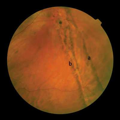 Рис. 1. Клапанный разрыв с субклинической отслойкой сетчатки у пациента Г.