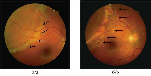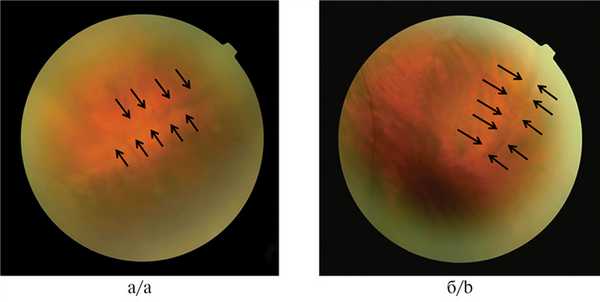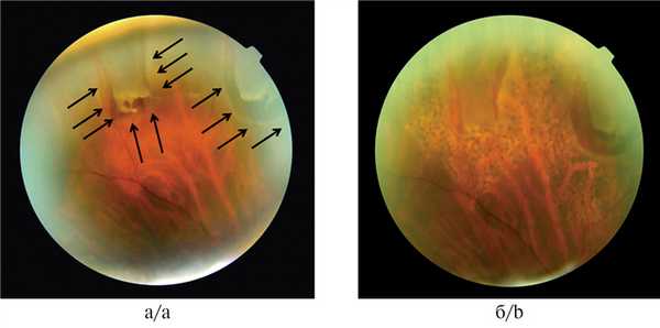 а — ЛКС в виде монотерапии неэффективна. Выполнена дополнительная лазерная коагуляция по новой границе ретиношизиса с пневморетинопексией и последующей ЛКС разрыва; б — дополнительная ЛКС по новой границе ретиношизиса проведена с целью профилактики смещения уровня ретиношизиса в макулярную зону при введении газа в полость стекловидного тела. Стрелками обозначены следы поэтапной ЛКС.