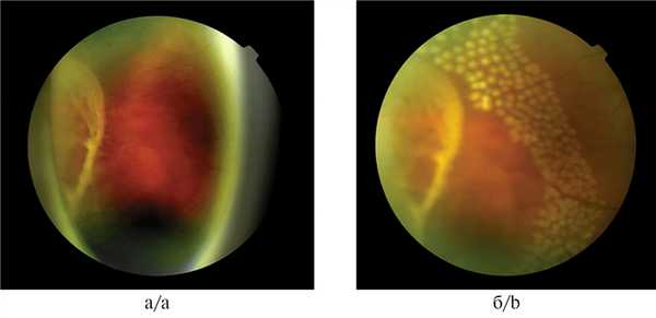 а — разрыв с ОС до этапа оперативного вмешательства; б — состояние после выполненного пломбирования и отграничительной коагуляции сетчатки.