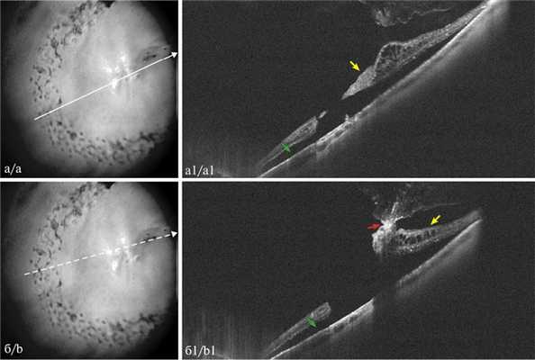 а — снимок ИК камерой наведения ОКТ с направлением линии сканирования (указана белой стрелкой) по краю клапана тракционного разрыва; a1 — соответствующий ОКТ-скан линии сканирования: клапан (указан желтой стрелкой), отслойка НС (указана зеленой стрелкой); б — снимок ИК камерой наведения ОКТ с направлением линии сканирования по пигментированному участку центра клапана (указан белой пунктирной стрелкой); б1 — соответствующий линейный скан: выраженная витреоретинальная тракция (указана красной стрелкой) на верхушке клапана (указан желтой стрелкой).