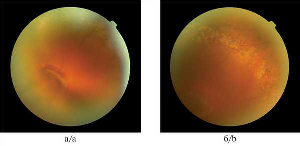 В 3-ю группу вошли 19 пациентов (24 глаза) с прогрессирующим ретиношизисом с разрывом во внутреннем листке (рис. 2, а, б; 3, а, б). Пациентам данной группы была выполнена только отграничительная ЛКС без дополнительных хирургических вмешательств.