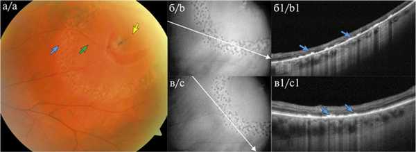а — цветная фотография клапанного разрыва (указан желтой стрелкой), зеленой стрелкой указана область субклинической отслойки, синей — плотный барьер лазерных коагулятов (навигационная лазерная система Navilas 577s); б, в — снимки инфракрасной камерой (ИК) наведения спектрального ОКТ RTVue XR Avanti, белой стрелкой указано направление сканирования вдоль лазерных коагулятов; б1, в1 — соответствующие линейные ОКТ-сканы: видны посткоагуляционные хориоретинальные спайки через 2 нед после ретинопексии (указаны синими стрелками).