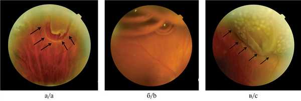 а — свежий клапанный разрыв; б — пневморетинопексия (пузырь газовоздушной смеси в полости стекловидного тела); в — склеропломбирование с последующей ЛКС на валу. Стрелками указаны края разрыва с ОС.