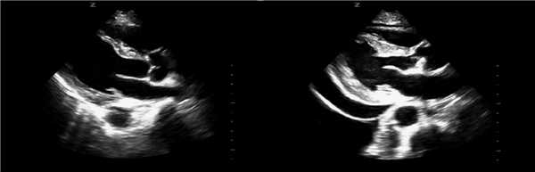 Рис. Эхо-признаки умеренного гидроперикарда, тампонады сердца у больного в ситуации шока.