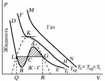 При квазистатическом сжатии, начиная с точки G, система распадается на 2 фазы - жидкость и газ, причем плотности жидкости и газа остаются при сжатии неизменными и равными их значениям в точках L и G соответственно. При сжатии количество вещества в газообразной фазе непрерывно уменьшается, а в жидкой фазе - увеличивается, пока не будет достигнута точка L, в которой все вещество перейдет в жидкое состояние.