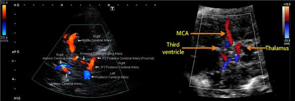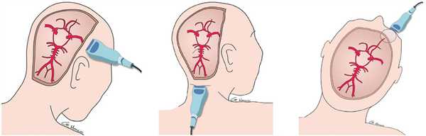 Анатомическим ориентиром при сканировании СМА, сифона ВСА, ПМА, СМВ является гиперэхогенная пирамида височной кости; сегмент А1 ПМА в проекции межполушарной щели; ЗМА, вена Розенталя, поперечника ОА рядом с ножками мозга; вена Галена, прямой синус и зоны синусовый сток в районе таламуса и III желудочка.