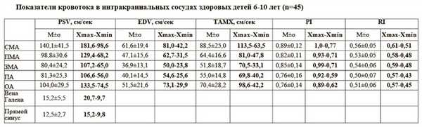 Таблица. Показатели кровотока в интракраниальных сосудах здоровых детей 3-5 лет