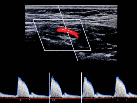 Врач кабинета УЗИ должен быть подготовлен для переключения датчиков, если это необходимо для выполнения обследования сосудов головы и шеи, и крайне важно иметь полное понимание управления техникой для оптимизации изображения и допплеровской информации. Пиковая систолическая скорость, конечная диастолическая скорость, направление кровотока, а также формы допплеровского спектра сигналов должны быть оценены с двух сторон для полного сравнения.