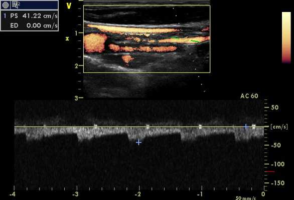 - Использовать малый контрольный объем допплера и 60-градусный угол.