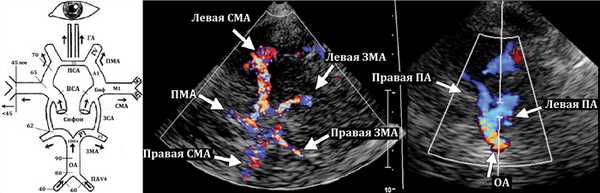 | Глазная артерия | 31,8±3,3 | 9,2±1,58 | 16,89±3,9 | 1,3±0,04 | 0,70±0,02 |