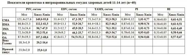 Таблица. Показатели кровотока в интракраниальных сосудах здоровых детей 11-14 лет