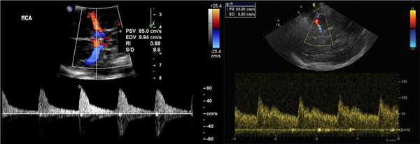Примечание: Vps - пиковая систолическая скорость кровотока, Vmean - усредненная по времени средняя скорость кровотока, Ved - конечная диастолическая скорость кровотока, PI - индекс пульсативности.