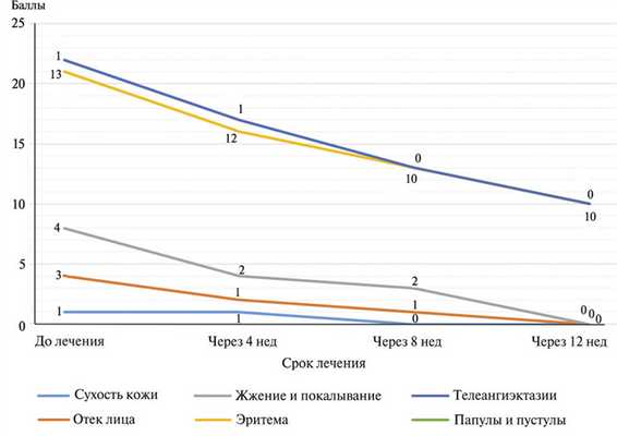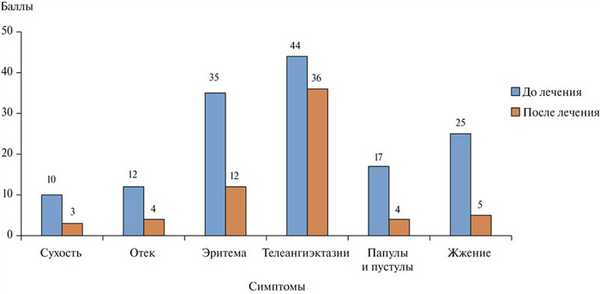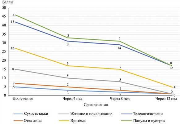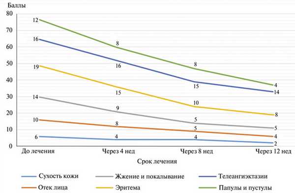 Если в целом оценивать динамику симптомов у всех групп пациентов, то сухость кожи уменьшилась на 70%, отек лица — на 66,7%, жжение — на 80%, эритема — на 65,7%, телеангиэктазии — на 18,2%, папулы и пустулы — на 76,5% (рис. 5). Рис. 5. Общая динамика симптомов.