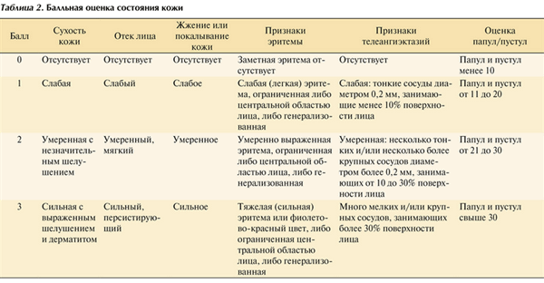 Для оценки эффективности комплексной терапии использовалась 4-балльная шкала тяжести, оценивающая такие проявления розацеа, как сухость кожи, отек лица, жжение, эритема, телеангиэктазии, папулы и пустулы (табл. 2). Таблица 2. Балльная оценка состояния кожи