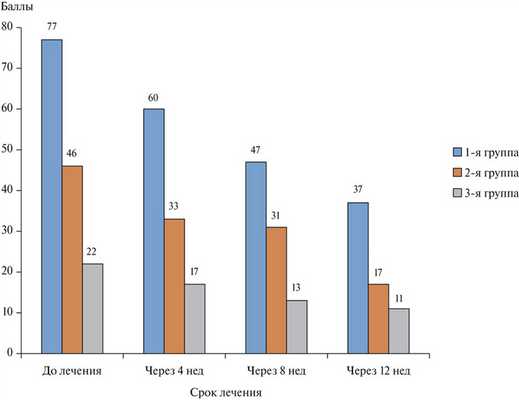 Оценку симптомов проводили до лечения, через 4, 8 и 12 нед лечения.