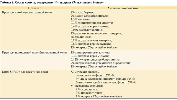 Средства, содержащие 1% экстракт Chrysanthelium indicum, в зависимости от вспомогательных компонентов предназначены для ухода за сухой и чувствительной кожей, нормальной и комбинированной, а также являются фотопротекторами (табл. 1). Таблица 1. Состав средств, содержащих 1% экстракт Chrysanthelium indicum