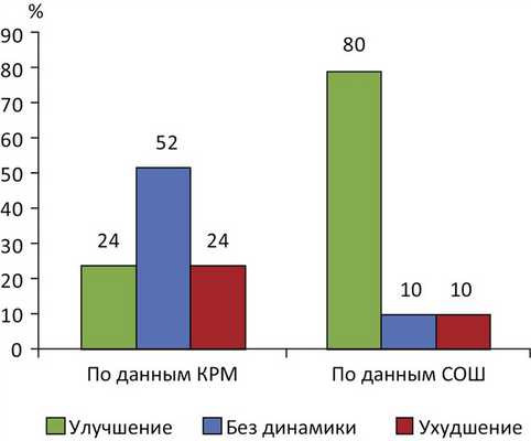 Эффективность хирургического лечения назальной обструкции по данным кардиореспираторного мониторирования ночного сна и субъективной оценочной шкалы (n=58; p<0,05). КРМ — кардиореспираторное мониторирование; СОШ — субъективная оценочная шкала.