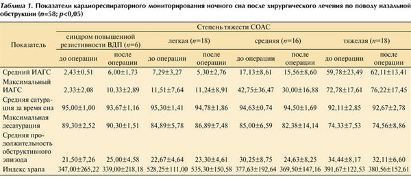 Таблица 1. Показатели кардиореспираторного мониторирования ночного сна после хирургического лечения по поводу назальной обструкции (n=58; p<0,05)