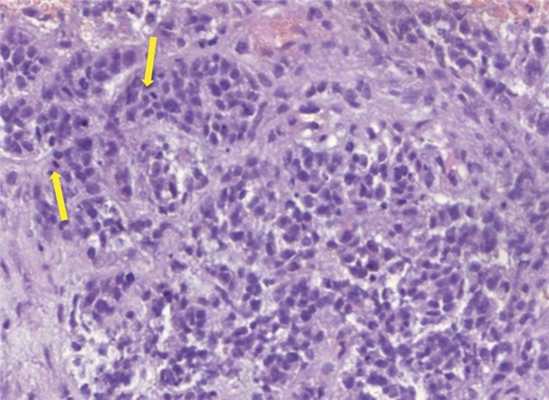 Опухоль краниовертебральной области (обозначена стрелкой)