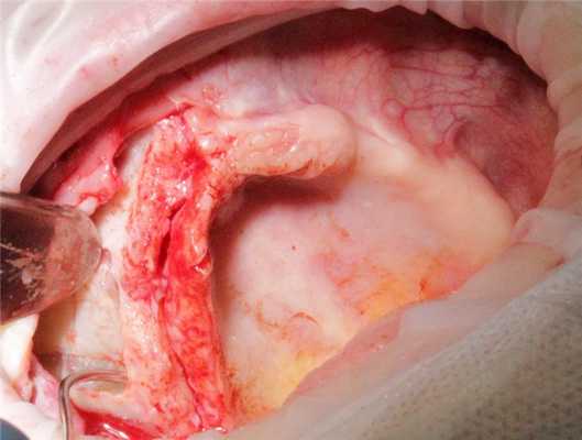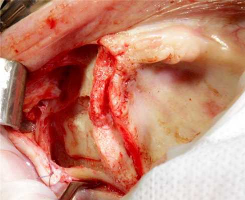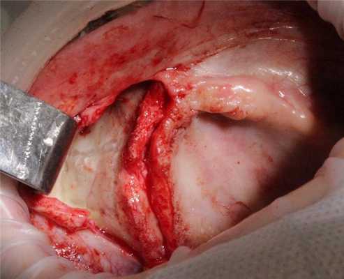 - Формирование костно-надкостнично-слизистого лоскута в области боковой стенки верхнечелюстной пазухи, отслаивание слизистой оболочки пазухи (фото 6)