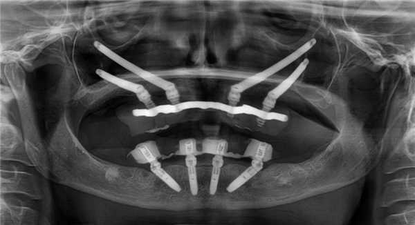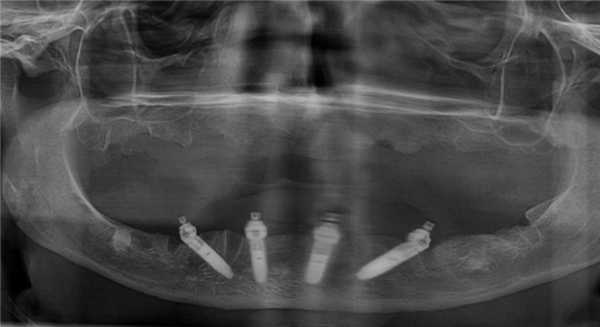 Фото 4. Ортопантомография через год после имплантации: стабильный уровень костной ткани вокруг имплантатов.
