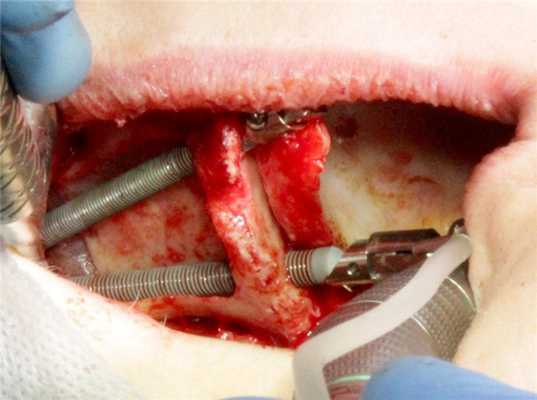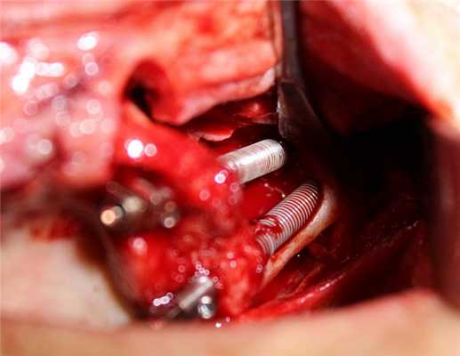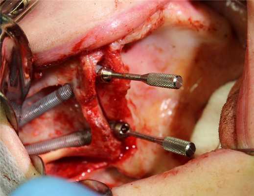 В месте установки будущих имплантатов проведена костная пластика для сохранения объема кости. Через два с половиной месяца после проведения компьютерной томографии нижней челюсти было решено установить внутрикостные винтовые имплантаты.