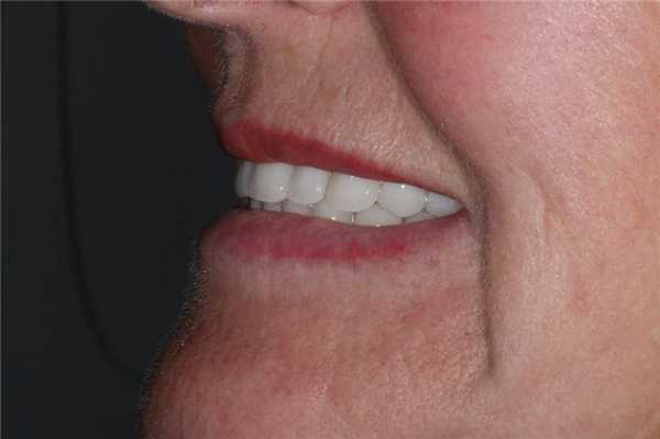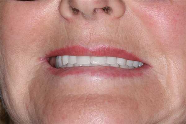 72-летняя пациентка обратилась за помощью по поводу неудовлетворительного вида своей улыбки. Она утверждала, что вид зубов ее не только старит, но также у нее присутствуют проблемы с жеванием. Лично ей не подходил ни вариант какого-либо длительного лечения, ни полный съемный протез в качестве альтернативы. При полной улыбке у пациентки обнажалось не более 2-3 мм клинической коронки (фото 10), таким образом, необходимости в дополнительных манипуляциях для редукции уровня костного гребня попросту не было.