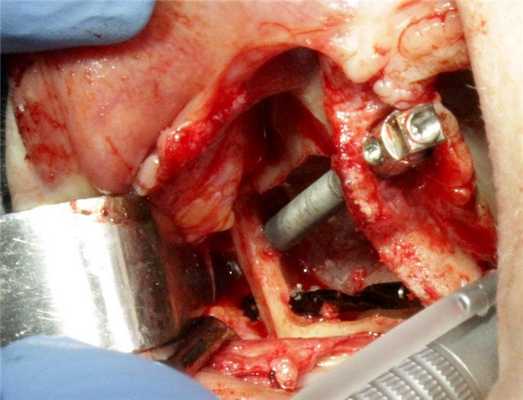 - Скелетирование внутренней поверхности скуловой кости, создание метки для верхнего имплантата (фото 8)