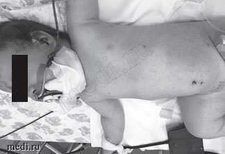 Бактериальные осложнения ветряной оспы характеризуются развитием вторичного инфицирования элементов ветряночной сыпи с образованием на коже абсцессов, импетиго, флегмоны, стрептодермии, рожи и др. Возможно сочетание бактериальных и неврологических осложнений у детей с иммунодефицитными состояниями, однако такие формы встречаются редко, отличаются тяжестью течения и неблагоприятным исходом. Ниже представлен случай ветряной оспы у ребенка 11 месяцев с развитием комбинированного осложнения в виде флегмоны и менингоэнцефалита.