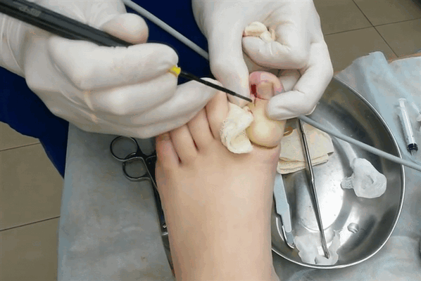 Перед операцией палец обработали антисептиком, вкололи в него раствор Новокаина и наложили на фалангу жгут, после чего вырезали часть ногтя со стороны врастания и часть валика. Новую ткань, которая образовалась вокруг раны, вычистили с помощью ложки Фолькмана. В конце операции проверили свёртываемость крови и убедились, что внутри нет инородных тел, после чего наложили асептическую повязку.