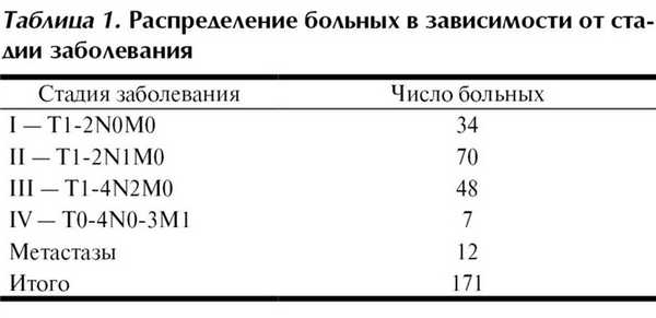Центральная локализация опухоли наблюдалась у 75 пациентов, периферическая - у 96. Распределение больных в зависимости от стадии заболевания представлено в табл. 1.
