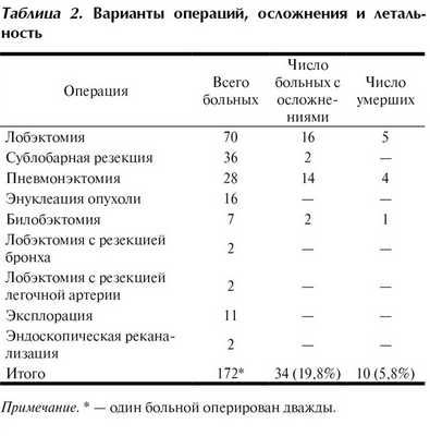 У 3 больных после пневмонэктомии послеоперационный период осложнился развитием бронхиального свища и эмпиемы плевры, 2 из них умерли. У 4 больных после сублобарной резекции легкого образовались остаточные полости. Им выполнили дренирование плевральной полости с постоянной аспирацией. Все эти больные были выписаны после ликвидации осложнения.