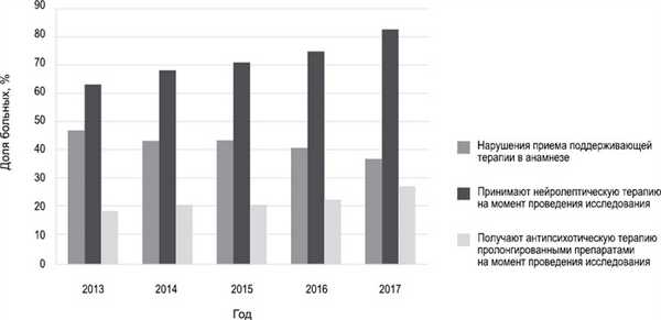 Несмотря на высокие показатели охвата терапией, во многих случаях врачами были отмечены нарушения режима приема лекарств. В соответствии с полученными данными, практически половина пациентов, диагноз которым был установлен в 2013 г., к моменту проведения исследования имели в анамнезе подобные эпизоды. Более 80% пациентов, диагноз которым был установлен в течение года, предшествовавшего проведению исследования, на момент заполнения карты принимали поддерживающую нейролептическую терапию, в то время как среди страдающих шизофренией с 2013 г. регулярно принимали нейроролептики лишь 63,2%. При этом около 1 /4 пациентов была назначена терапия пролонгированными формами нейролептиков.