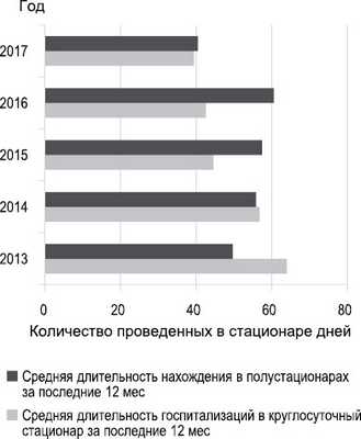 Рис. 7. Общая длительность госпитализаций в круглосуточный стационар и полустационары за последние 12 мес.